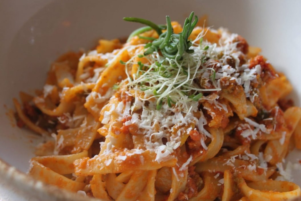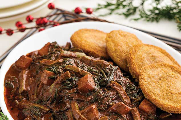 alcaparras, aceitunas, almendras y piñón cocinado en una salsa de jitomate con albahaca, vino blanco y brandy.